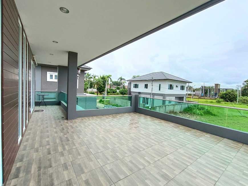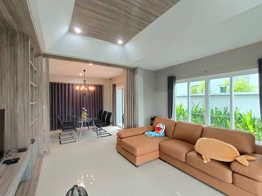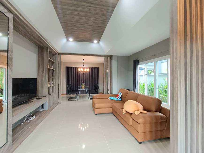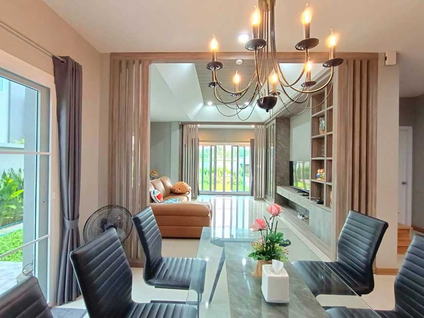 บิวอินทั้งหลังด้วยงานสถาปัตย์ทั้งภายนอกและภายในบ้านหรูหราสวยงามน่าอยู่ มีระเบียงกว้างใหญ่ ห้องรับแขกพร้อมงานฝ้าหลุมขนาดใหญ่ ห้องอาหาร,เคาท์เตอร์บาร์และครัวยุโรปเชื่อมต่อถึงกันแบบ open plan รายล้อมไปด้วยกระจกบานเปิดขนาดใหญ่ตามแบบบ้านสมัยใหม่ให้สามารถชมวิวสวนได้ 180 องศาจากภายในตัวบ้านเพื่อความโปร่งโล่งสบายอากาศถ่ายเทได้สะดวกมาก